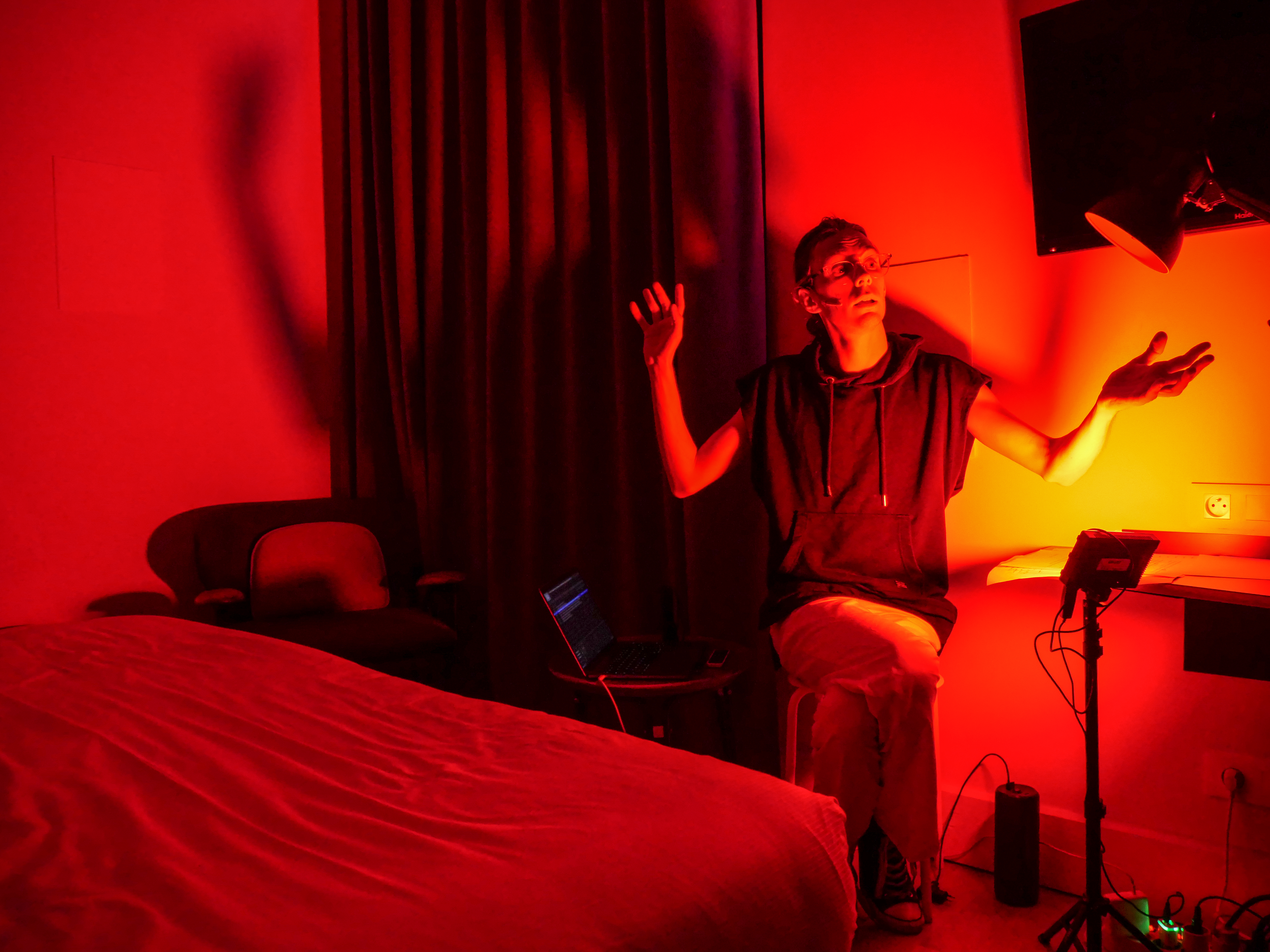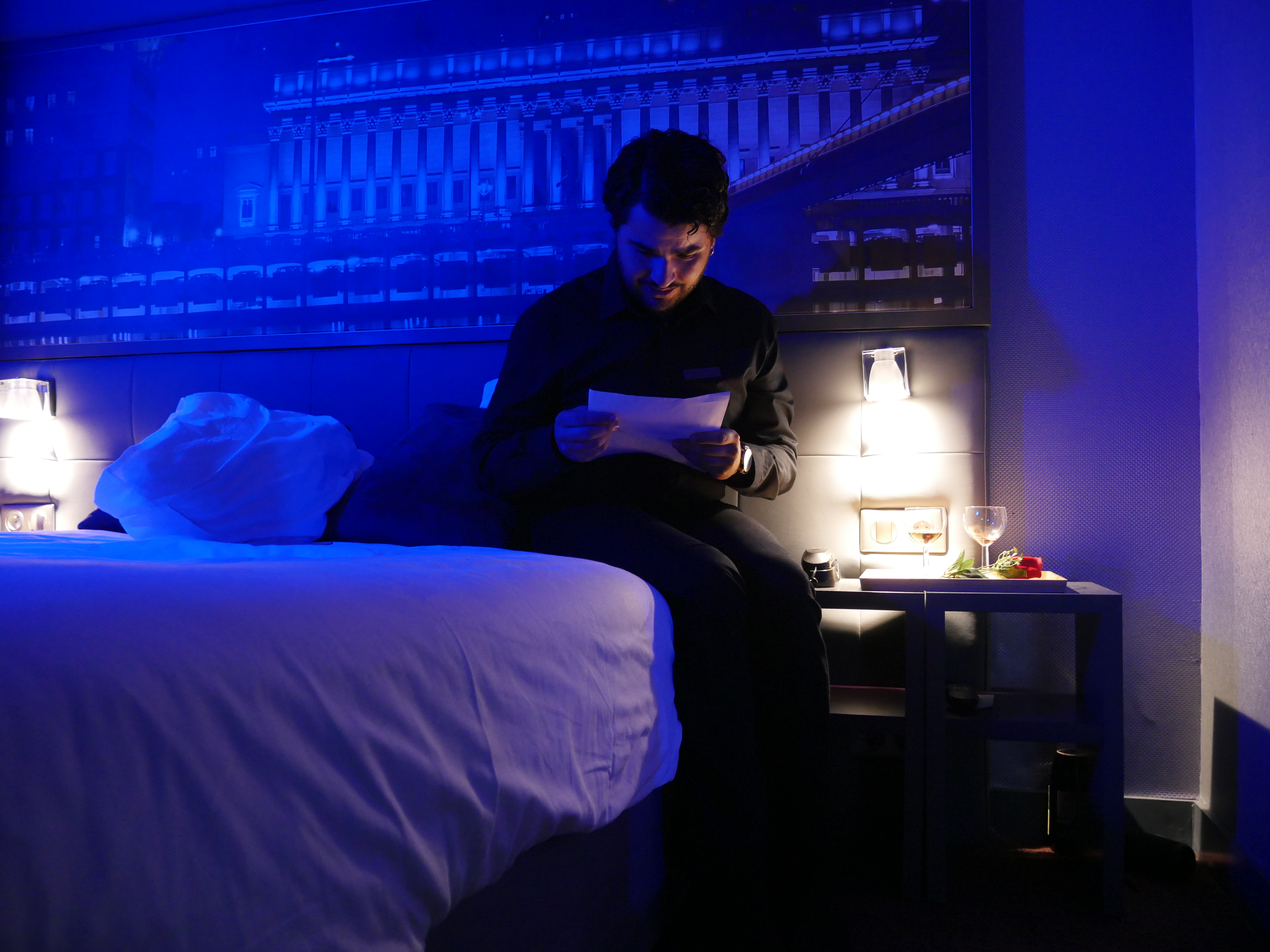 À trois heures du matin, dans le silence de l’hôtel endormi, le veilleur chante en comédie musicale ses rêveries sur les vies des client·es inconnu·es.